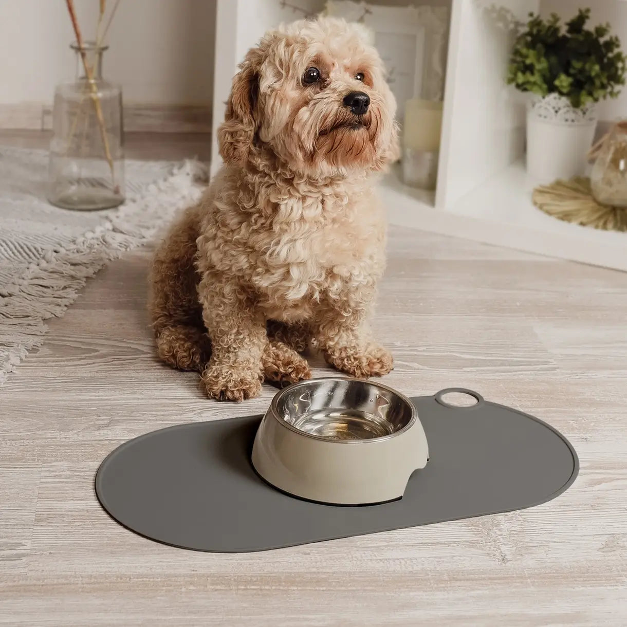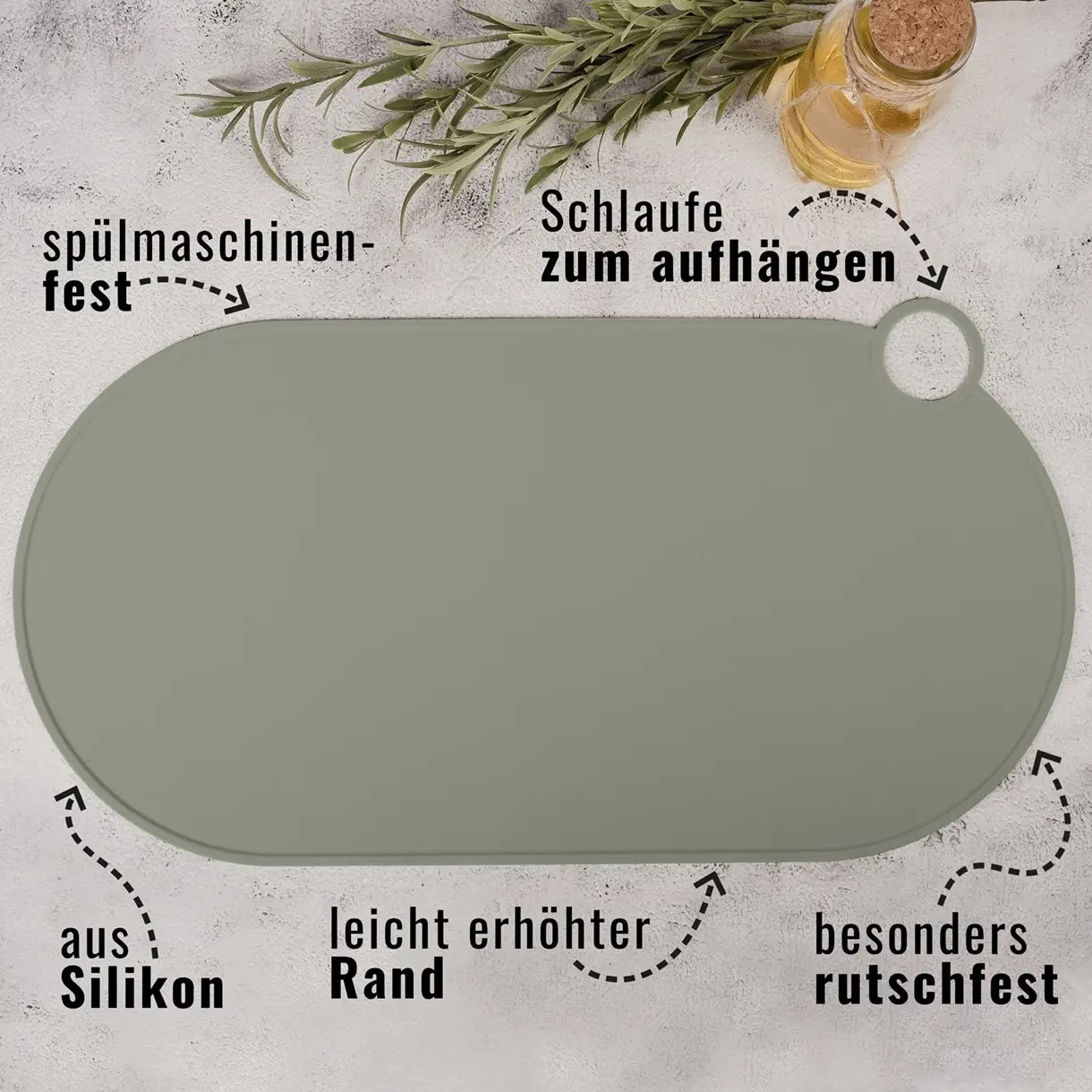 Praktische Napfunterlage aus hochwertigem Silikon mit modernem Design. Die matte Oberfläche, abgerundete Ecken und die runde Aufhängeschlaufe sorgen für einen stilvollen Look und machen sie zum perfekten Helfer im Futterbereich.